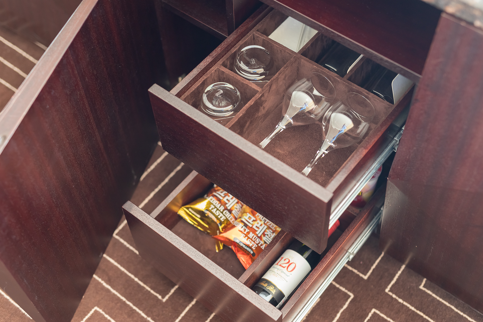 서랍을 열면 유리잔과 간식, 와인(별도 요금)