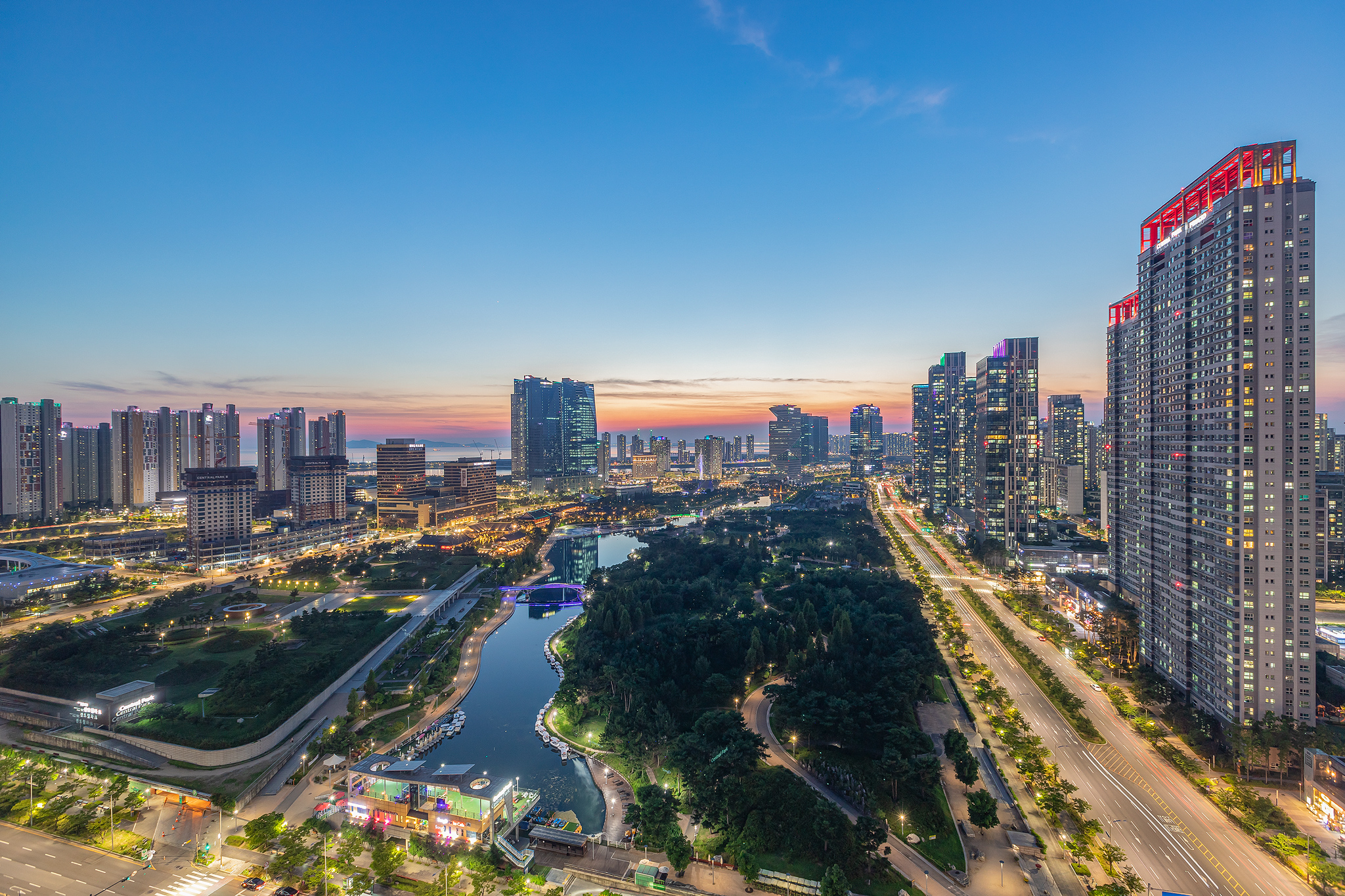 공원과 바다가 함께하는 송도의 저녁 풍경
