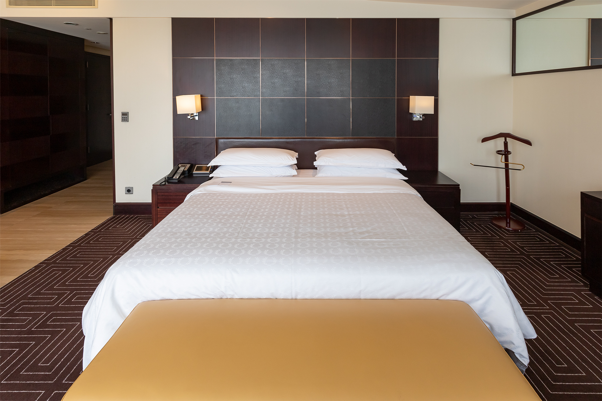 쉐라톤 그랜드 인천 호텔의 스위트 룸은 거실과 침실로 나뉘지 않고 하나의 큰 방으로 구성되어 있습니다.
