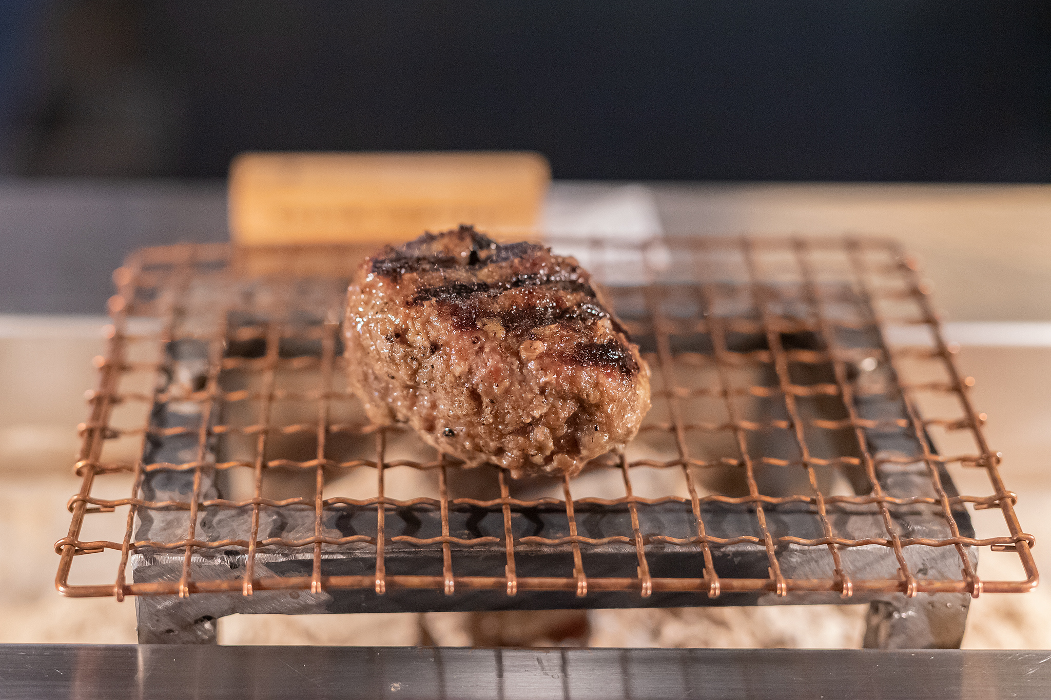 고기가 다 익으면 하나씩 자리 앞의 철그물판에 햄버그를 올려놓습니다.