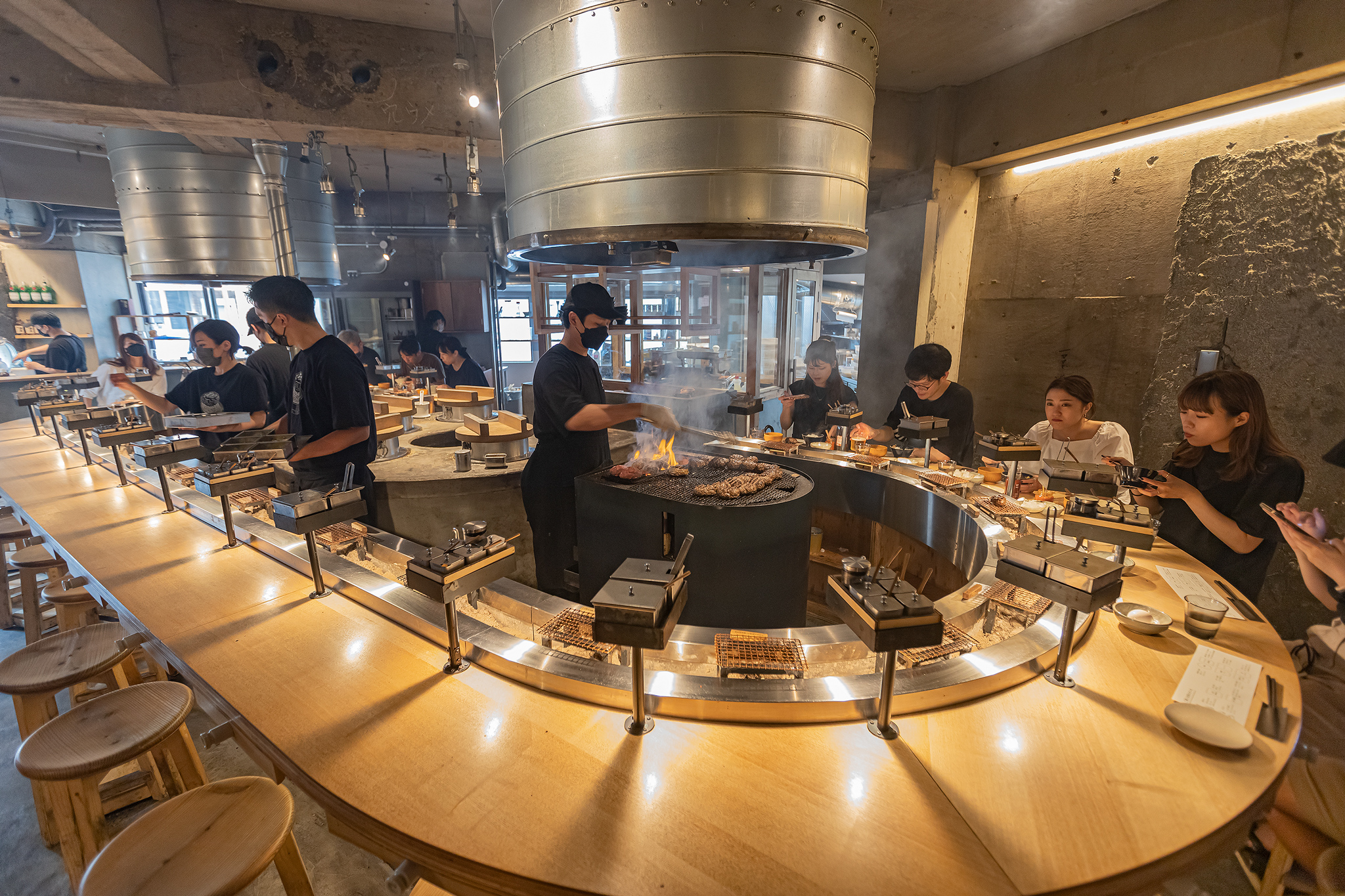 가게는 요리하는 것을 직접 보면서 맛볼 수 있는 라운드형 카운터 자리이며