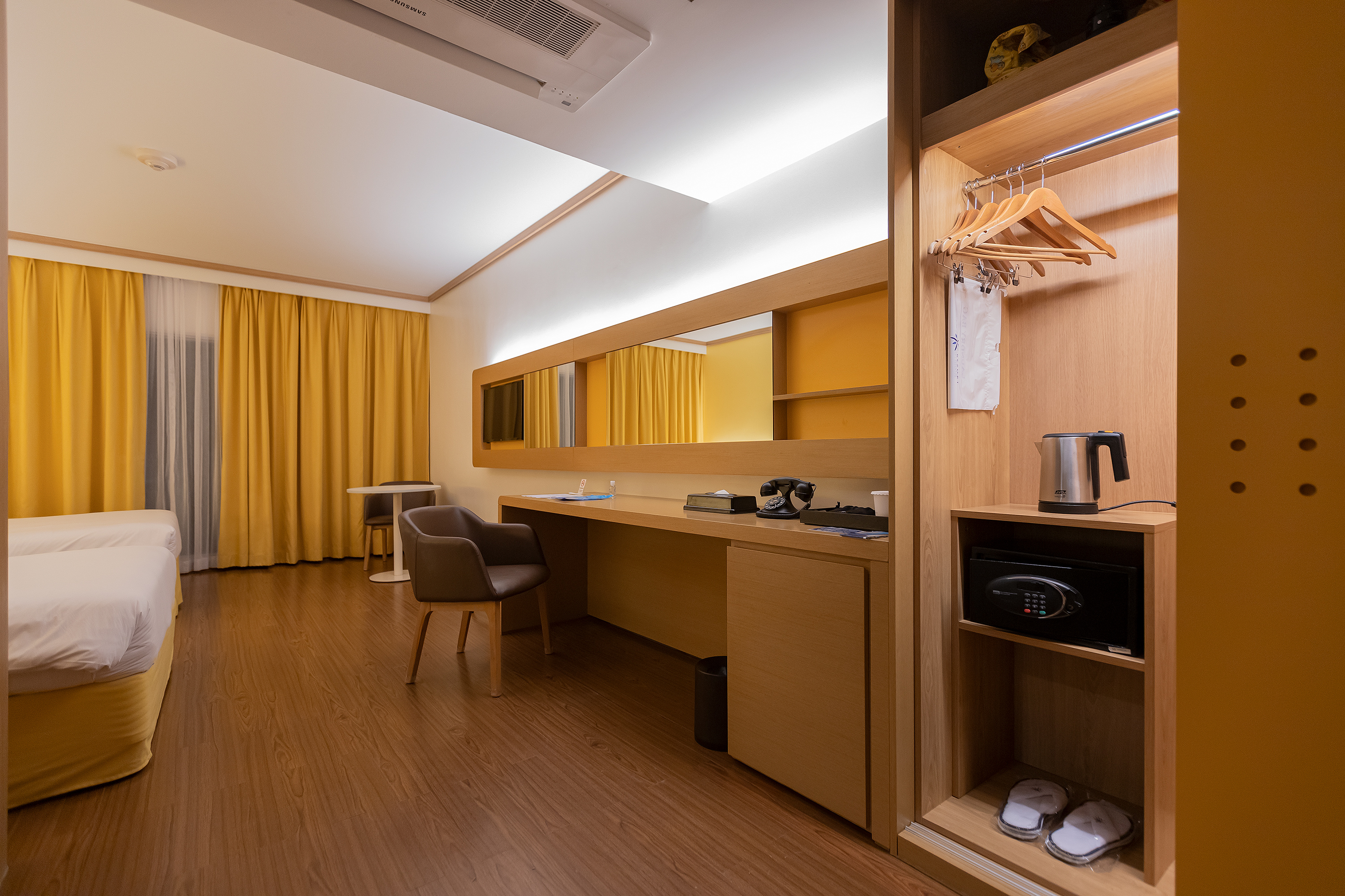 넉넉한 크기의 침대 두개 가 놓여 있는 트윈룸