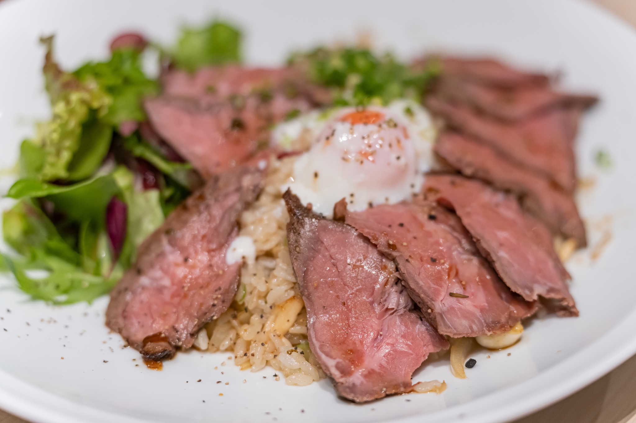 볶음밥 위에 부드러운 아까우시 로스트비프와 온천 계란을 올렸습니다.