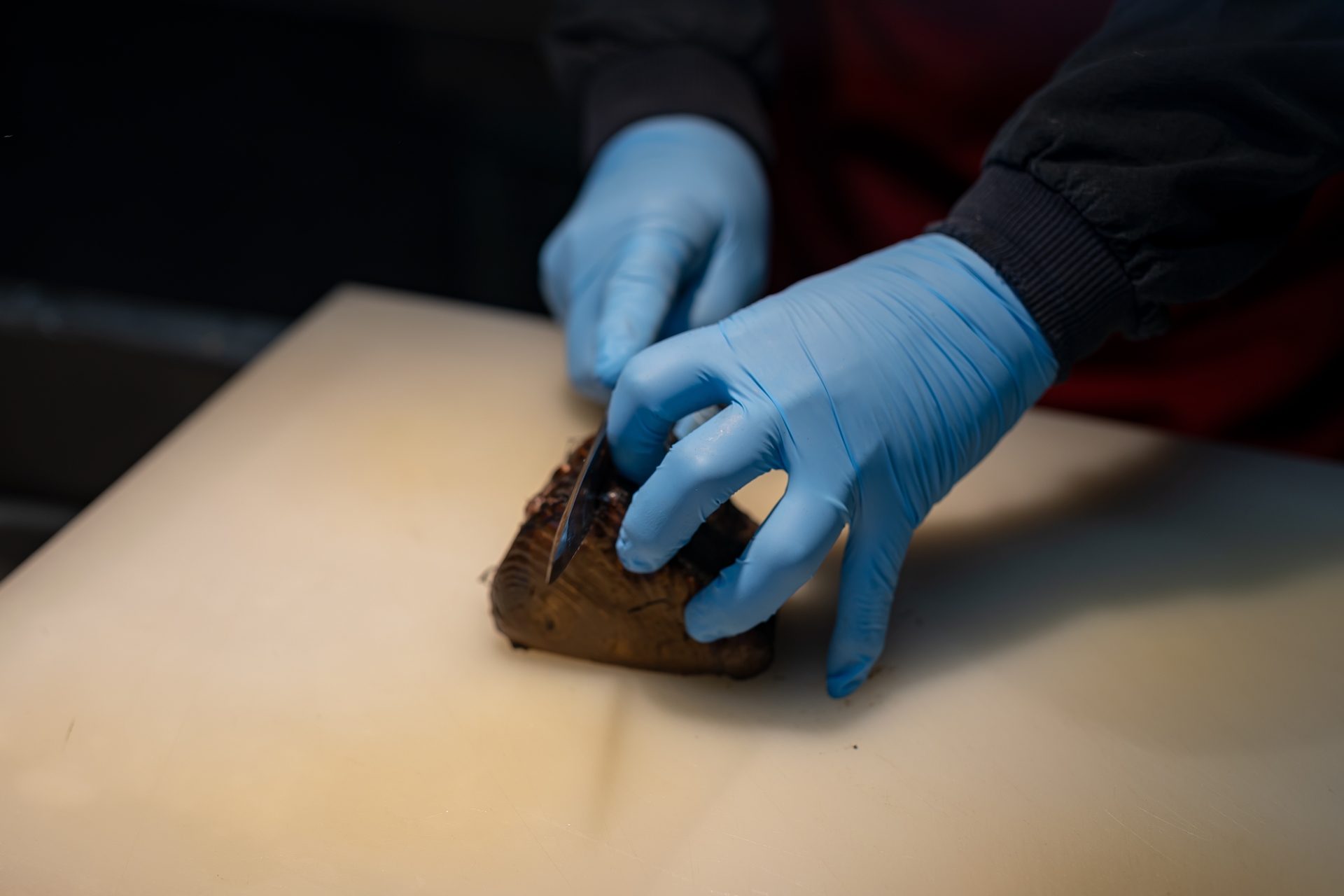 주방의 점원에게 건내주고 먹기 좋은 크기로 잘라냅니다.