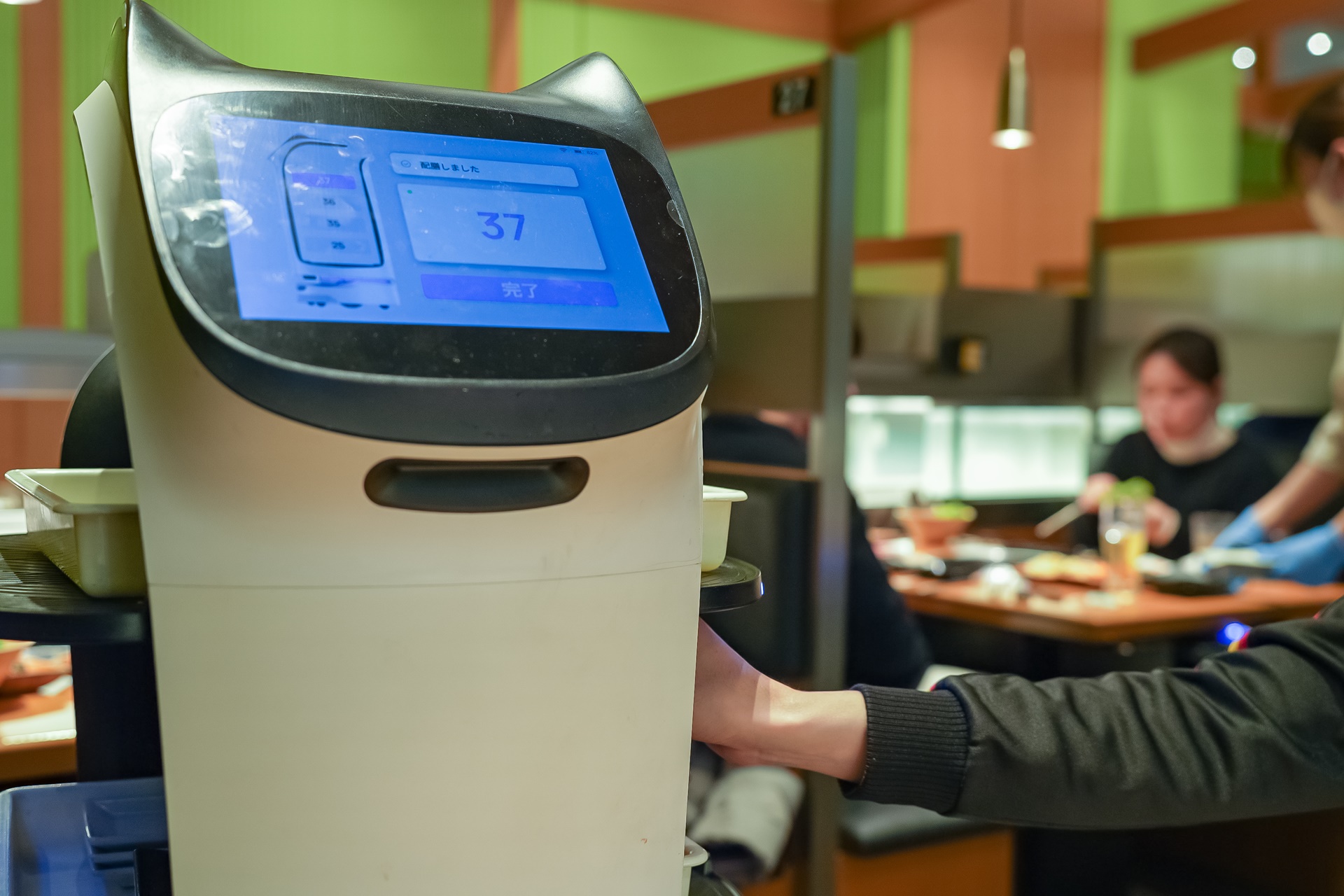 접시는 직원이 와서 치워주기도 하는데 고양이 로봇을 호출하면 로봇이 와서 먹은 접시를 올려 놓으면 됩니다.