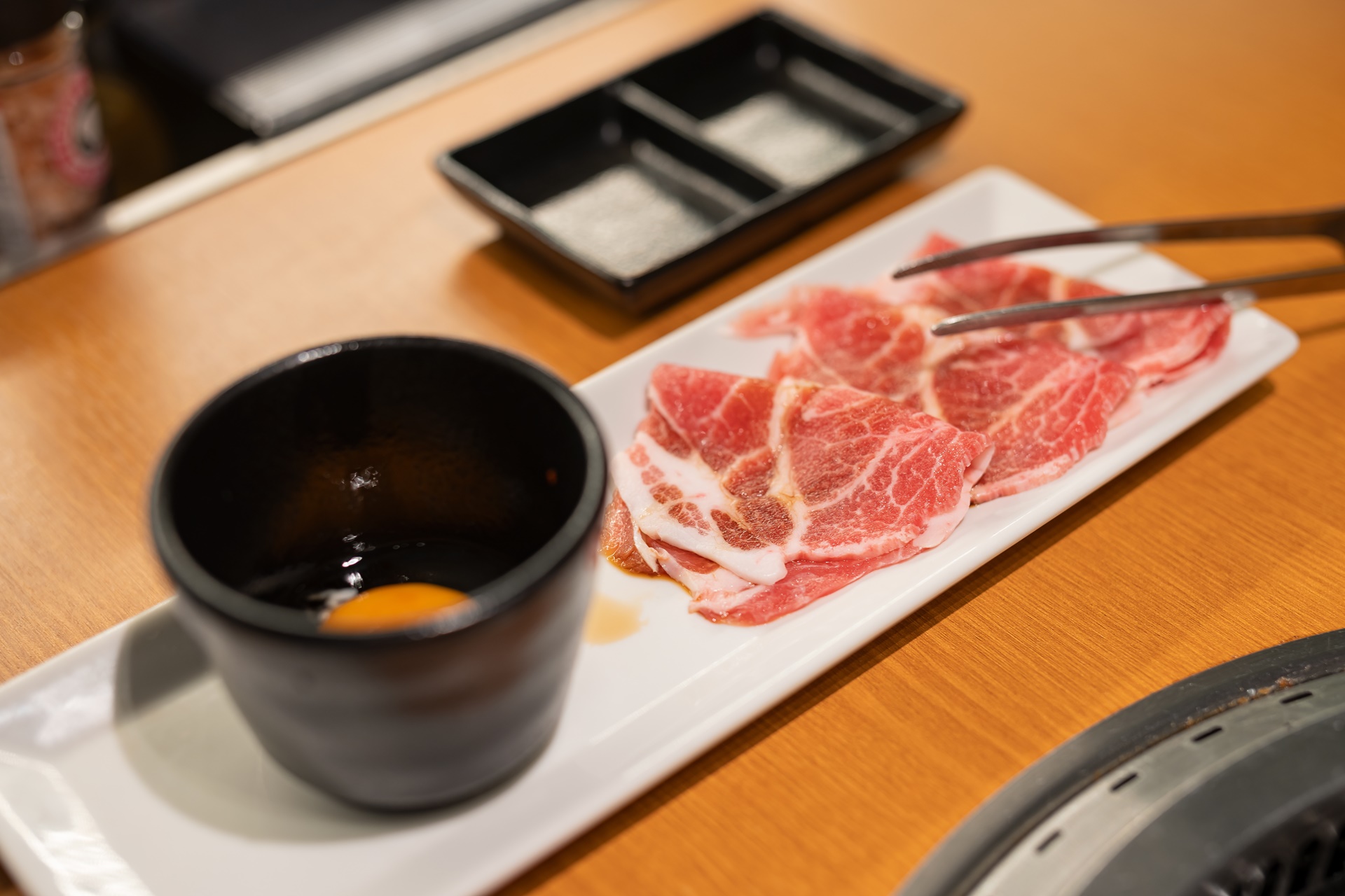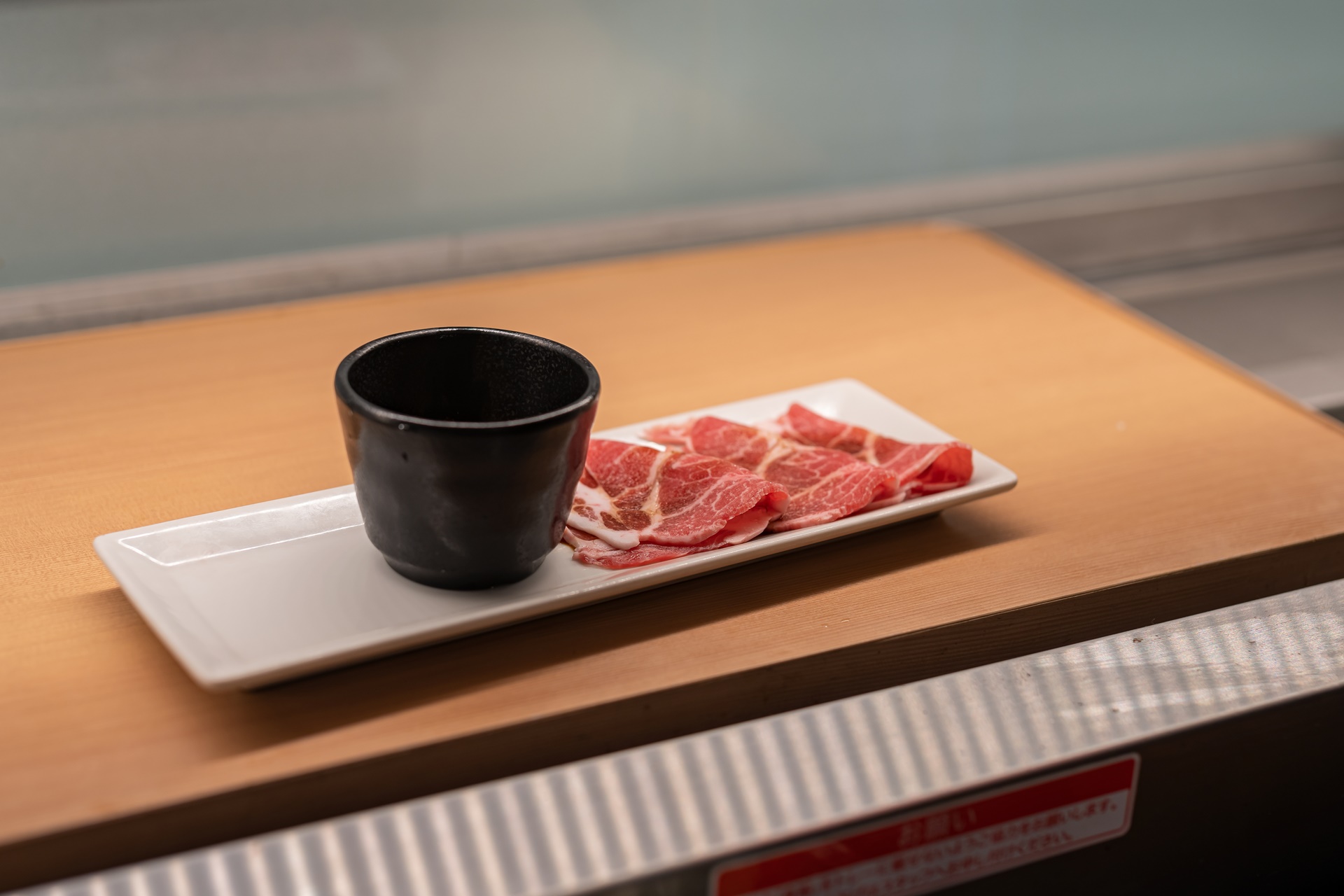 가고시마 산 소고기를 얇게 썰어서 구운다음 계란과 스키야키 양념에 찍어 먹습니다.