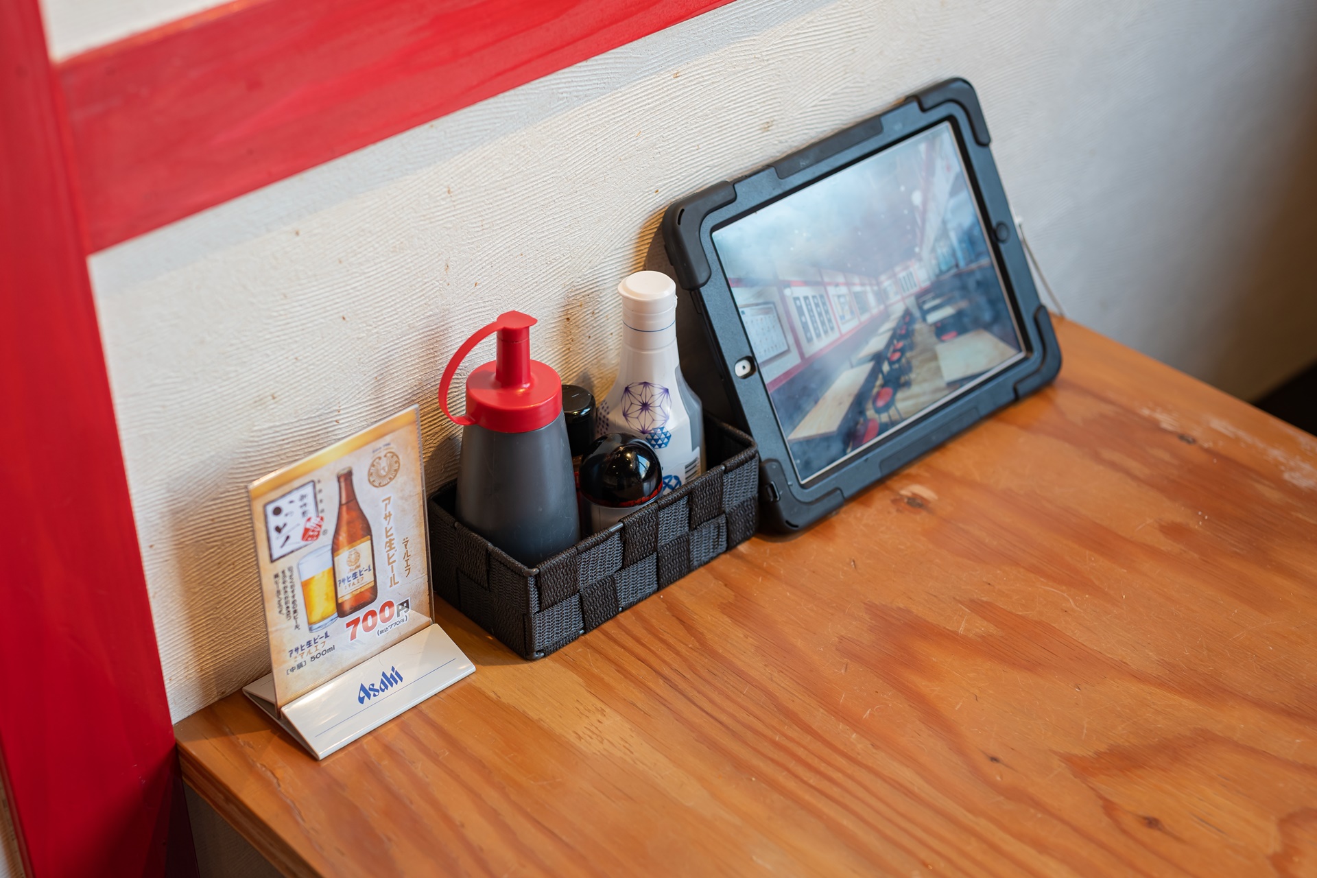 테이블 위에는 쿠시카츠에 겯들여 먹을 다양한 소스와 테이블에서 주문이 가능한 전자 터치패드가 놓여 있었습니다.