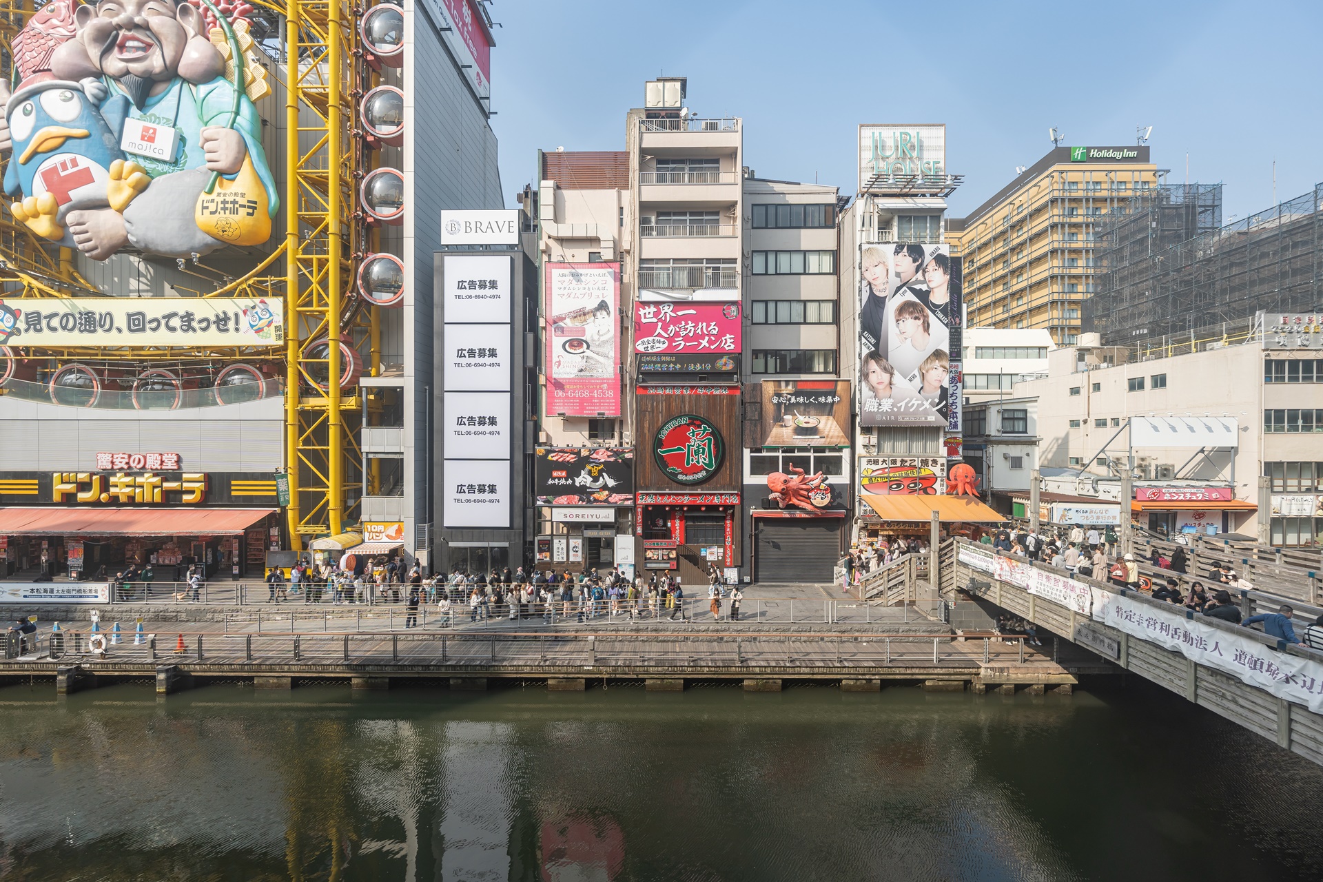 돈키호테, 앗치치혼포, 이치란등 인가 가게들이 많기도 하고 이곳의 다리 위에서 도톰보리 강의 야경을 감상하거나 사진을 찍는 사람들이 많은데 가게 안에서 편하게 구경할 수 있습니다. 저녁에 이곳에서 쿠시카츠를 먹으며 야경을 감상하고 돈키호테의 줄을 가늠해보며 사람이 적다 싶으면 나가서 쇼핑을 즐겨도 좋을 것 같습니다.
