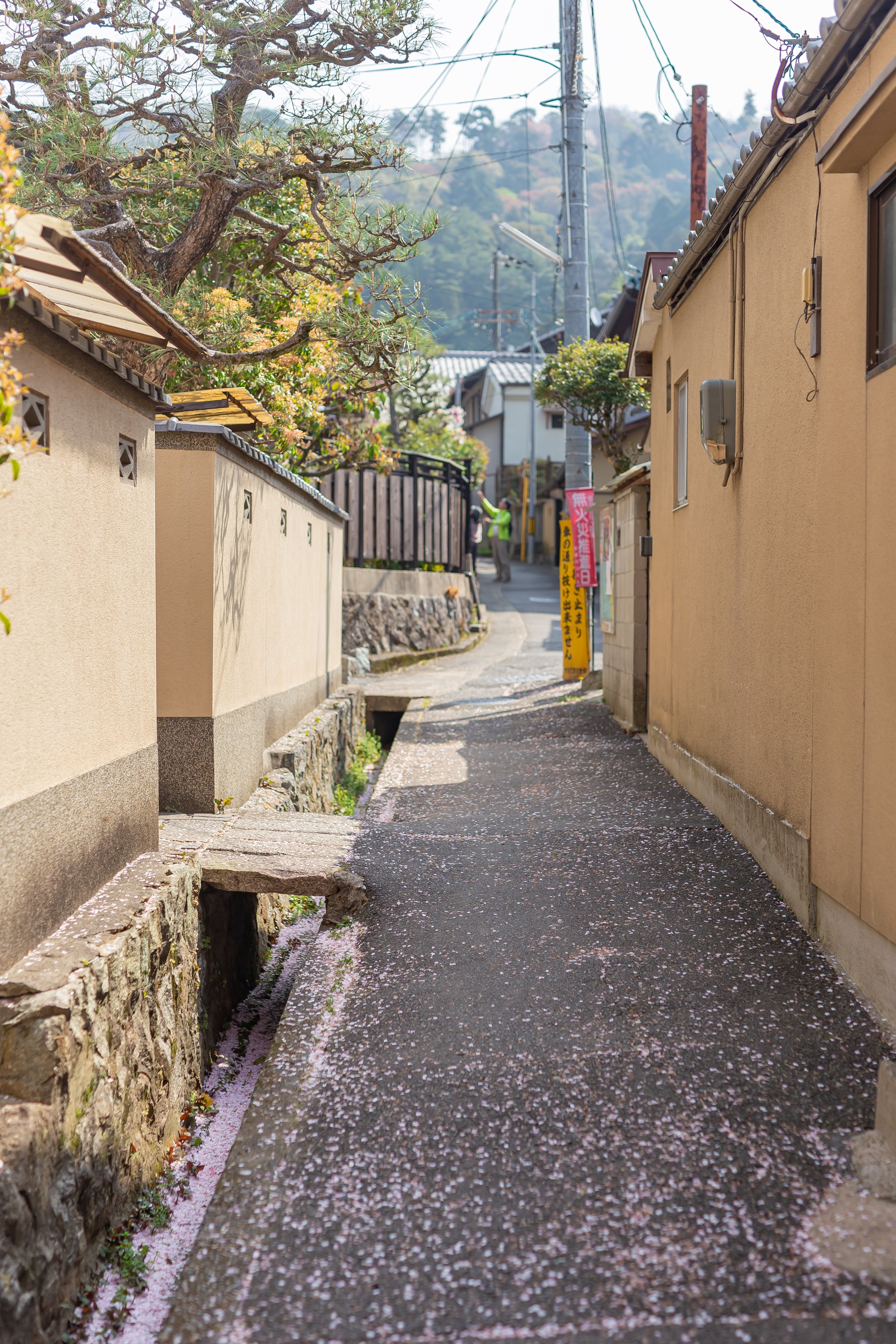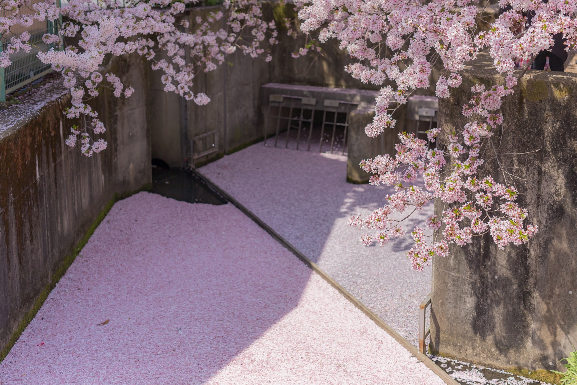 벚꽃 비가 내려 철학의 길 곳곳을 벚꽃으로 물들입니다.