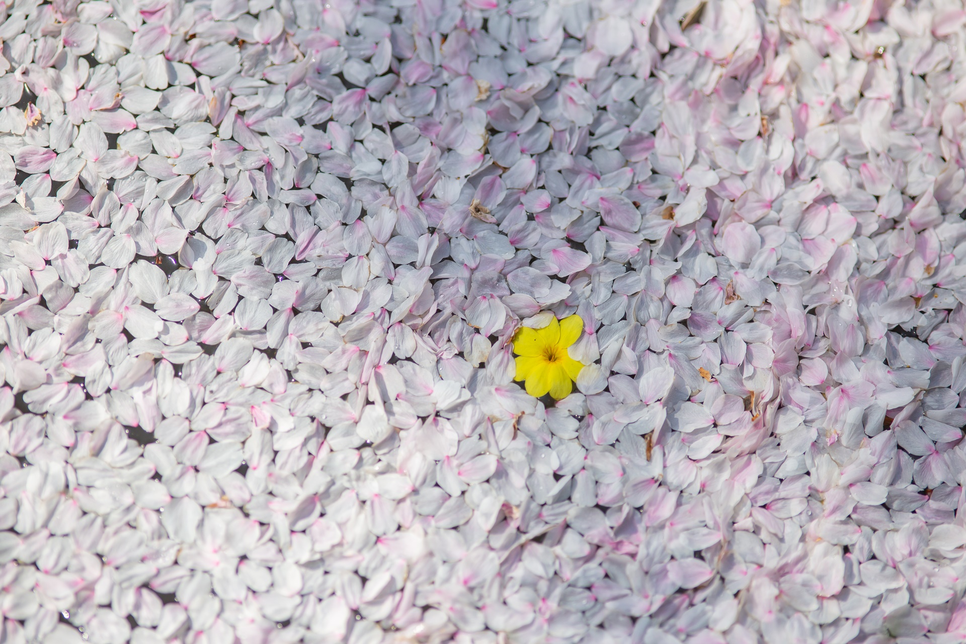 벚꽃 잎 위에 노란 꽃이 활작 피었습니다.