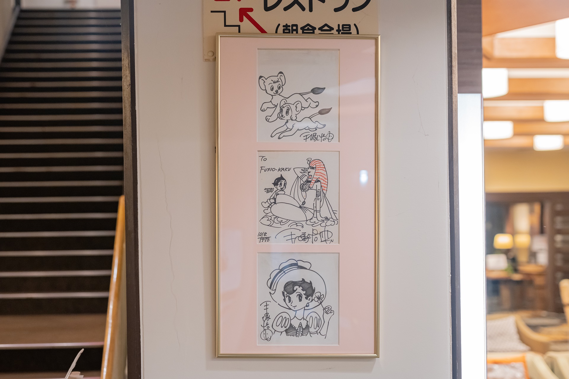 한국 드라마보다 더 눈에 띄었던건 일본의 만신인 만화가 데즈카 오사무(手塚 治虫) 의 친필 싸인과 만화가 그려진 액자가 였습니다. 데즈카 오사무도 이곳에서 숙박을 하였고 기념으로 밀림의 왕자 레오, 아톰, 리본의 기사의 만화가 그려진 귀한 사인을 남기고 간것 같습니다.