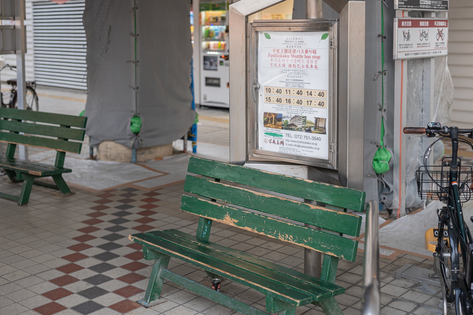 택시 승강장과 버스 정류장이 있는 이케다 역 북동쪽 출구 아래 쪽에 위치해 있으며 녹색 벤치 위에 후시오카쿠 온천료칸 셔틀버스 안내가 적혀 있습니다.