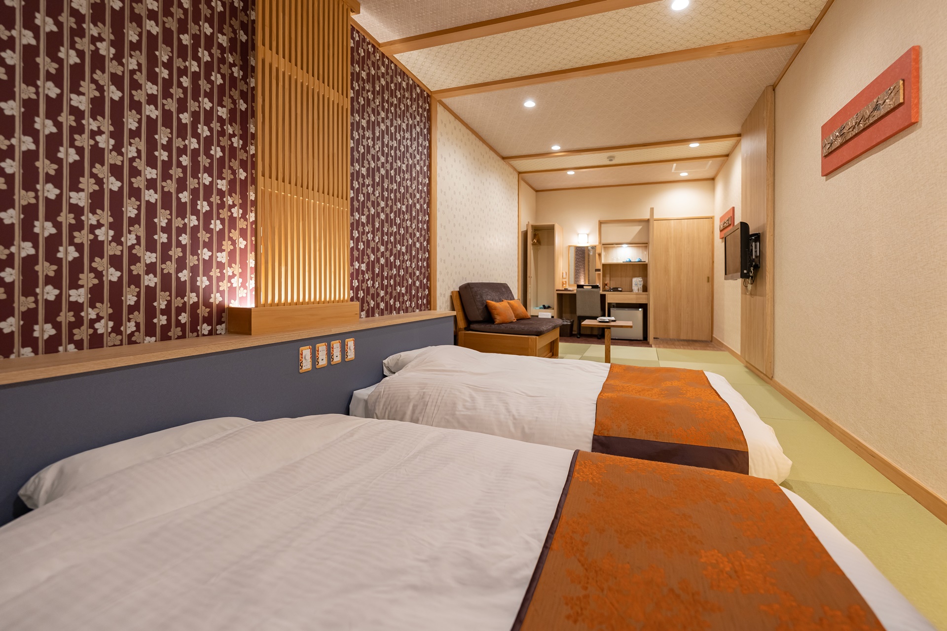 다다미 위에 트윈 침대가 놓여있으며 사이즈는 싱글보다 살짝 큰 느낌이었습니다.