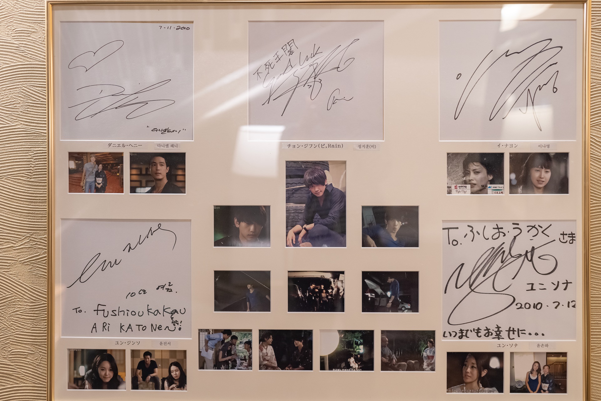 다니엘 헤리, 윤진서, 이나영, 윤손하, 엄복동의 사인과 료칸에서의 촬영 장면이 담긴 사진