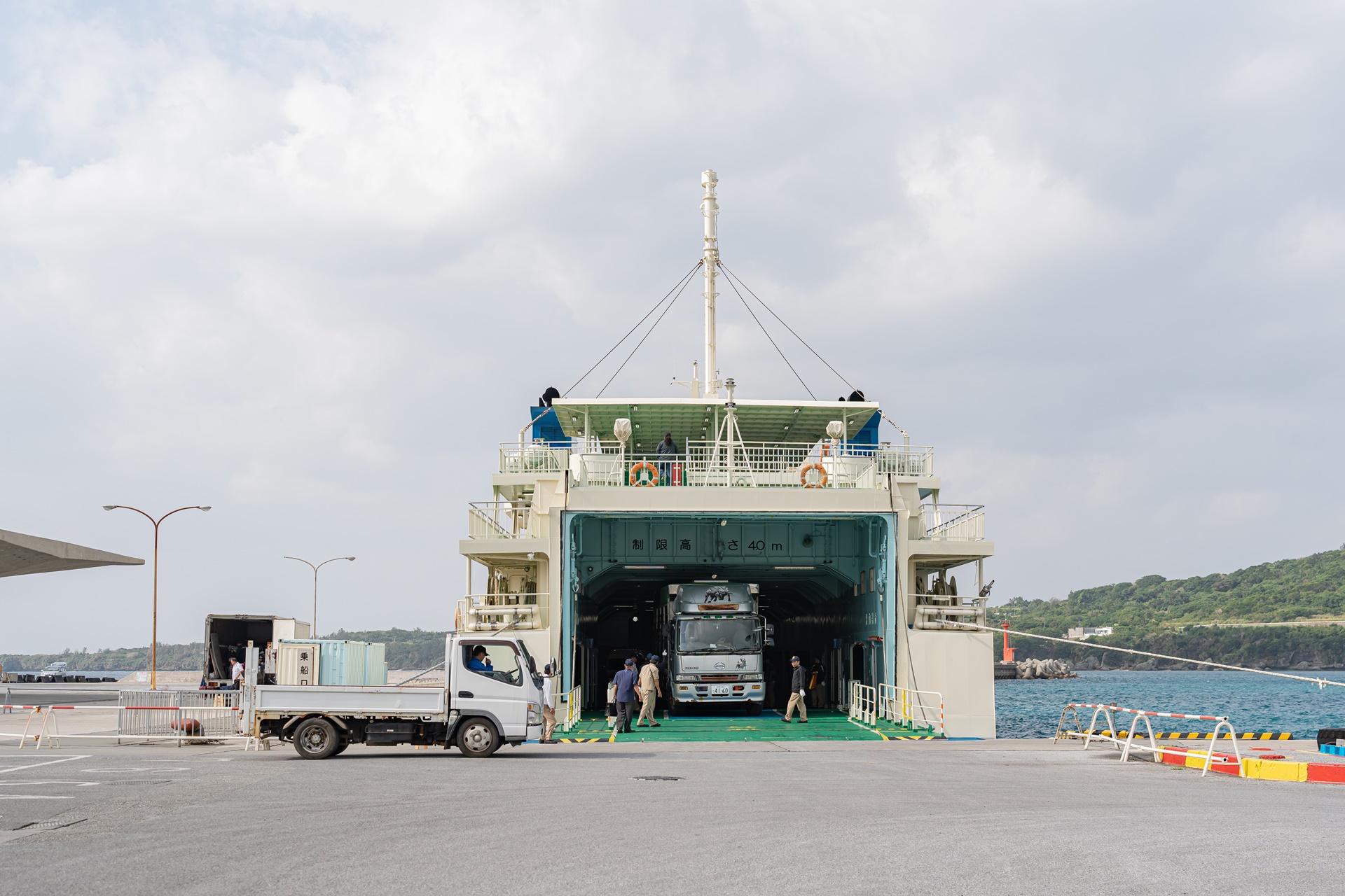 이에섬 페리가 모토부 항구에 도착하였습니다.
