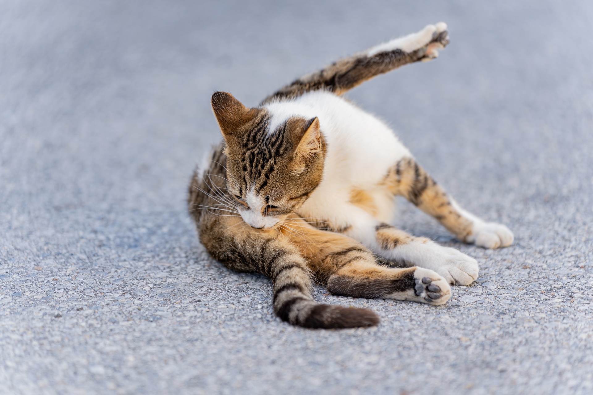아크로 바탁한 자세로 그루밍을 하고 있는 반 고등어 무늬 고양이