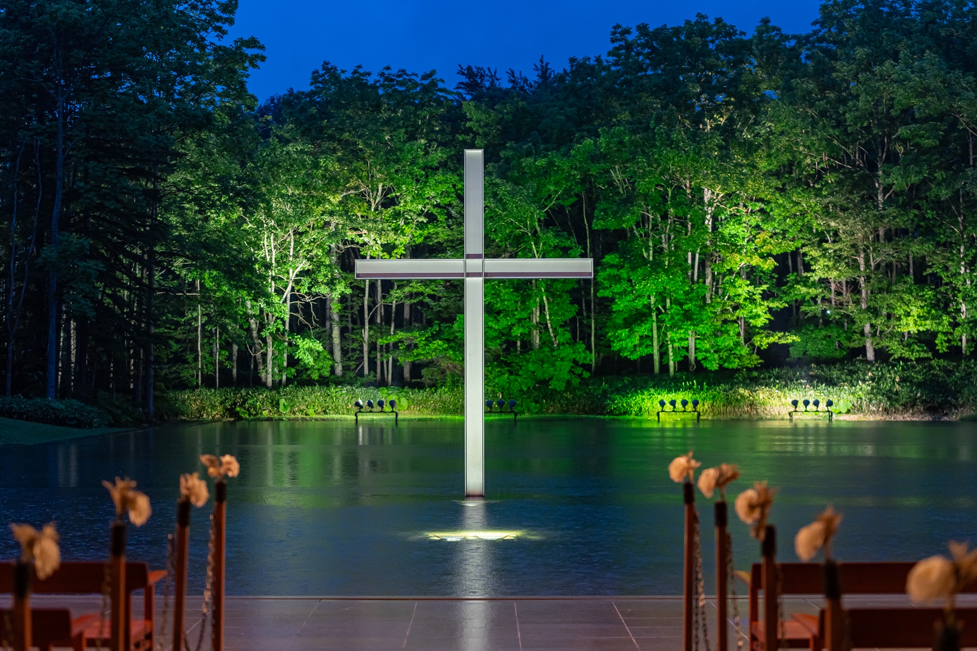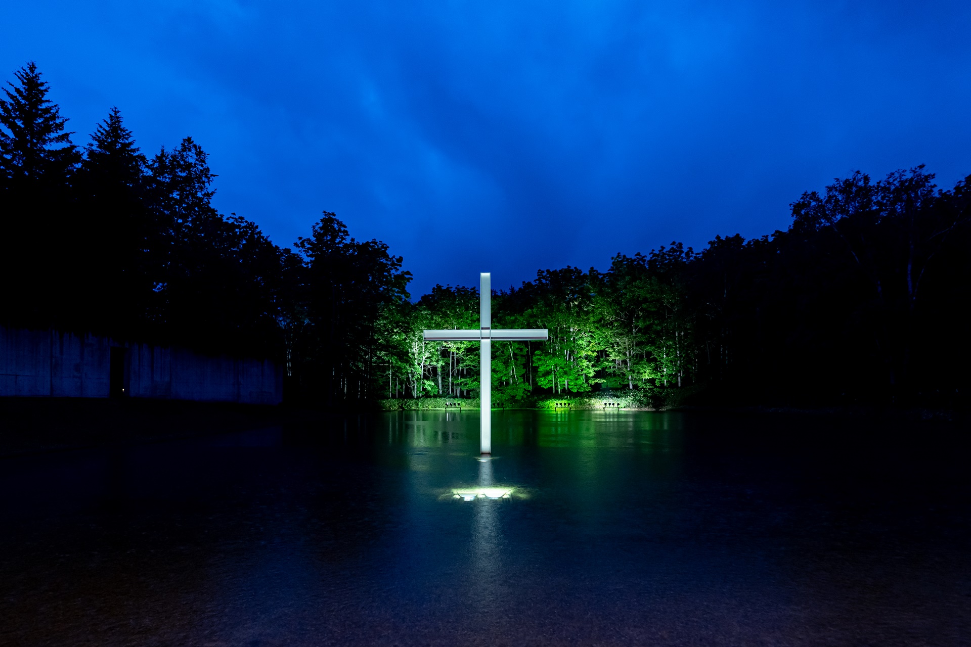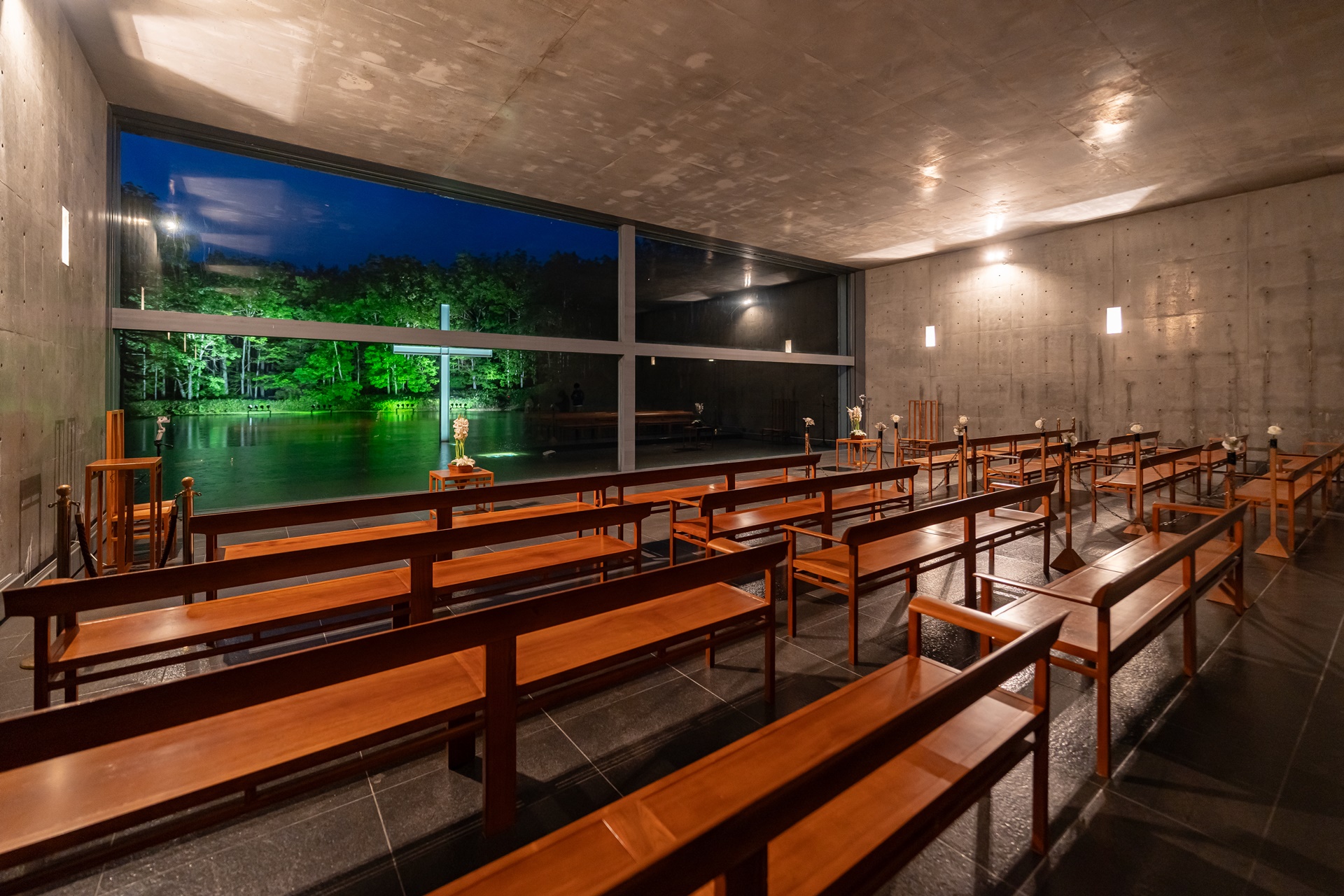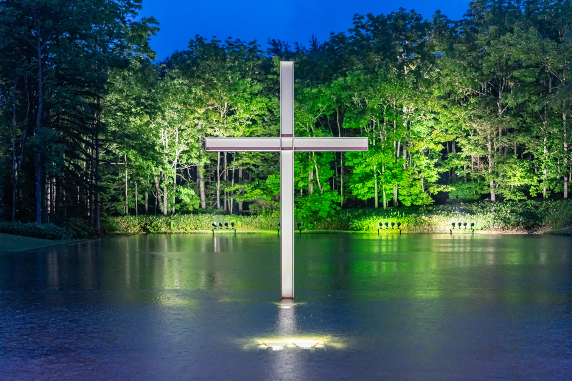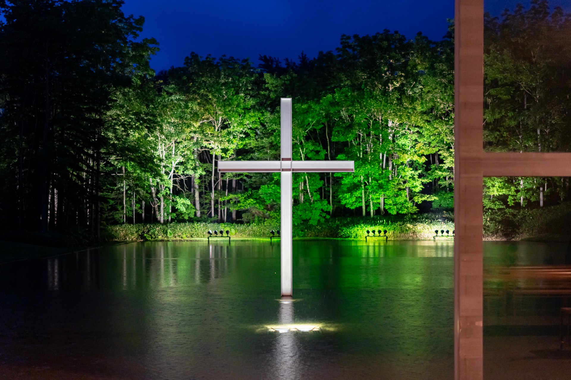저녁에는 라이트 업을 하여 낮과는 또 다른 느낌으로 물의 교회를 감상할 수 있습니다.