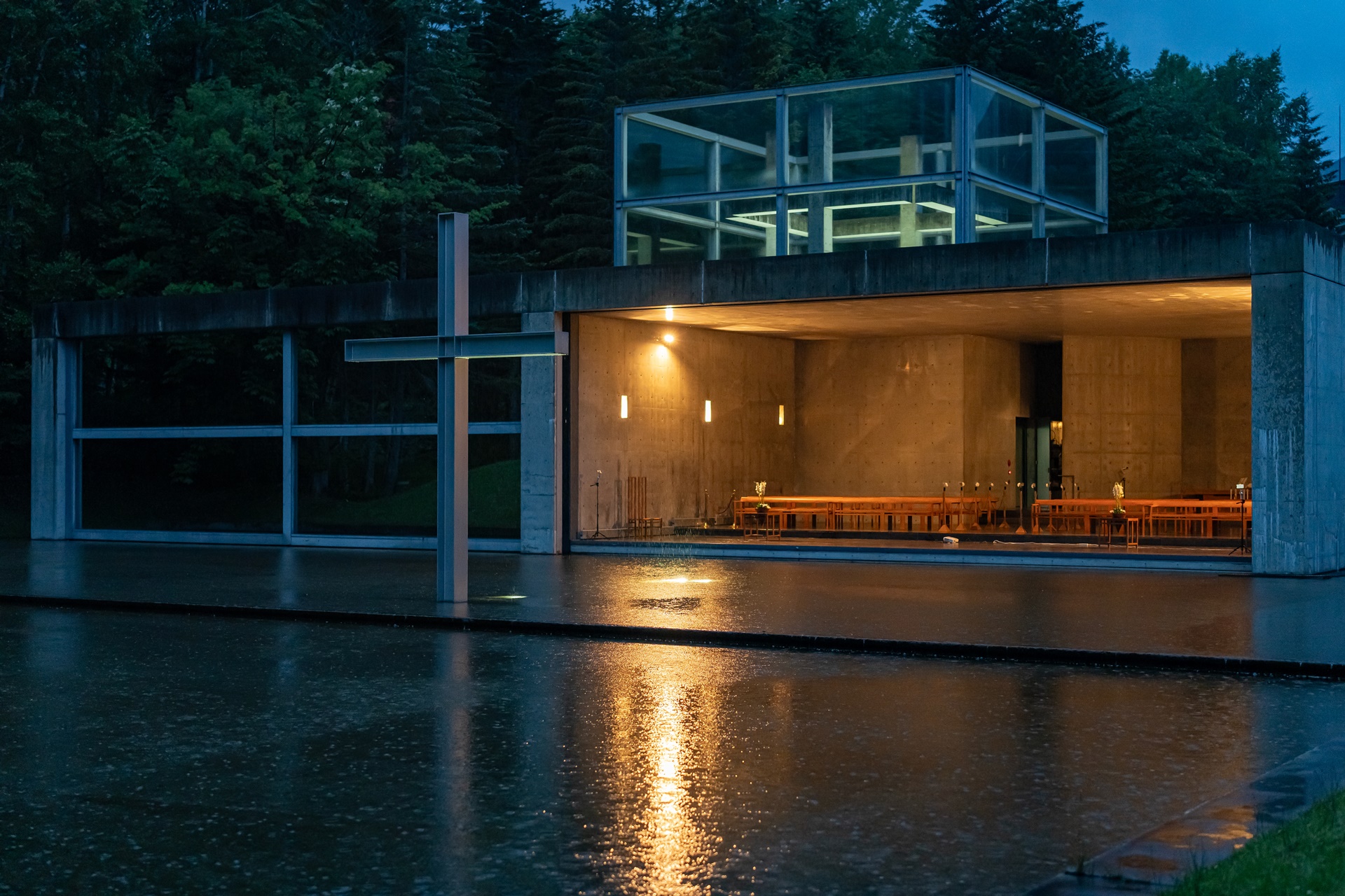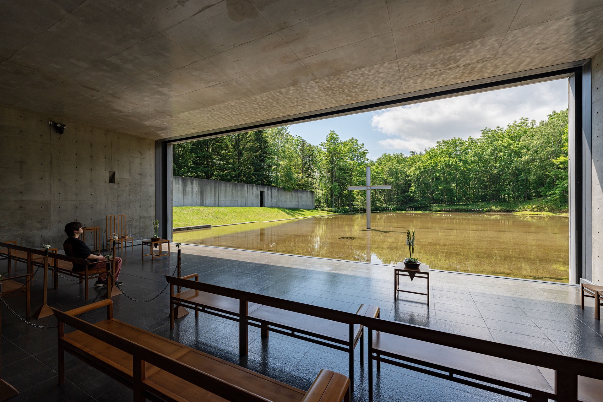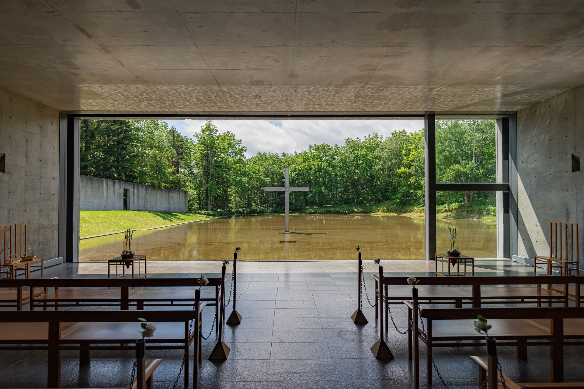 홋카이도 여행, 호시노 리조트 토마무 안도 다다오의 물의 교회 일본의 대표적인 건축가이자 세계적으로도 유명한 안도 다다오의 건축물은 노출 콘크리트 외관과 직사각형의 길다란 창이 특징