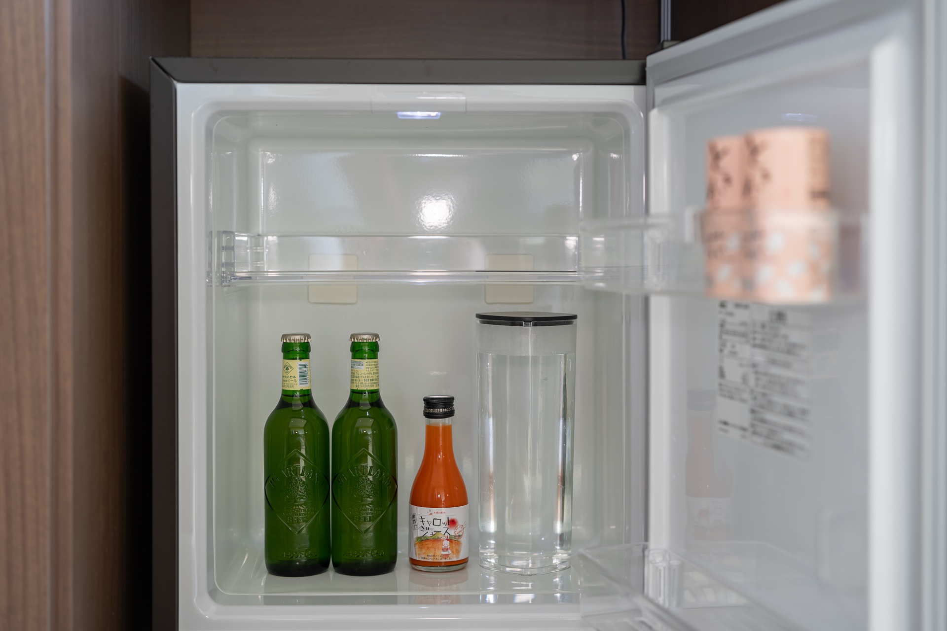 호시노 리조트 계열의 호텔이나 료칸들은 환경을 위해 플라스틱 페트병을 두지 않고 물병을 냉장고에 두는 것이 특징입니다.