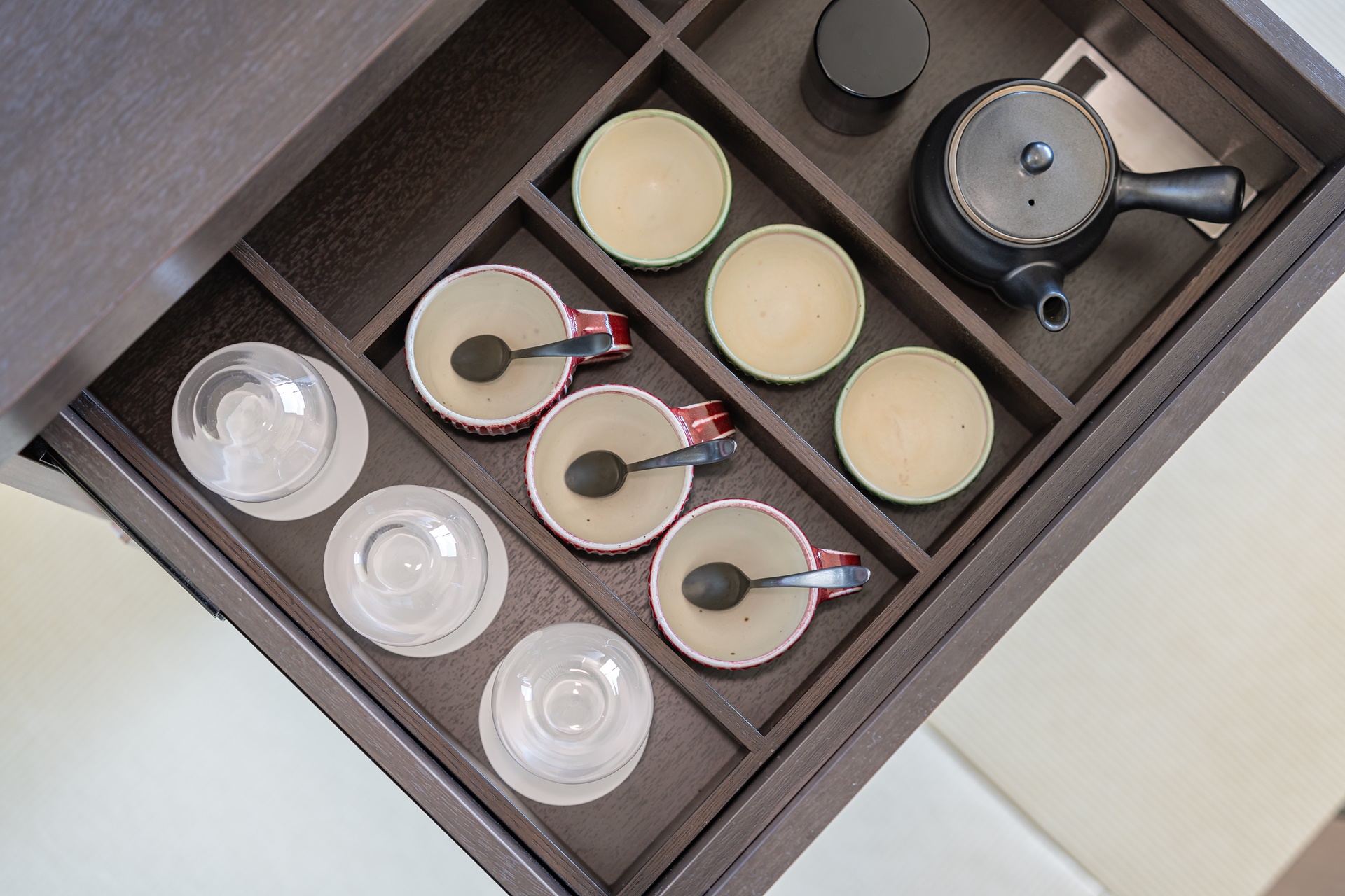 가고시마는 생산량으로는 일본에서 시즈오카와 함께 1~2위를 다툴 정도로 녹차가 많이 재배되는 지역입니다. 그래서 인지 카이 기리시마에서도 다양한 녹차 티백이 준비되어 있었으며 미리 내려놓은 녹차도 있었습니다. 그 옆에는 물과 커피