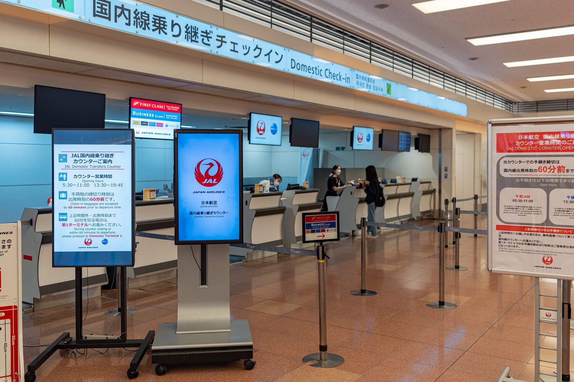 국내선 경유를 위해 하네다 국제선 출구에서 바로 오른쪽에 있는 국내선 환승 탑승 수속 카운터에 짐을 보냅니다.