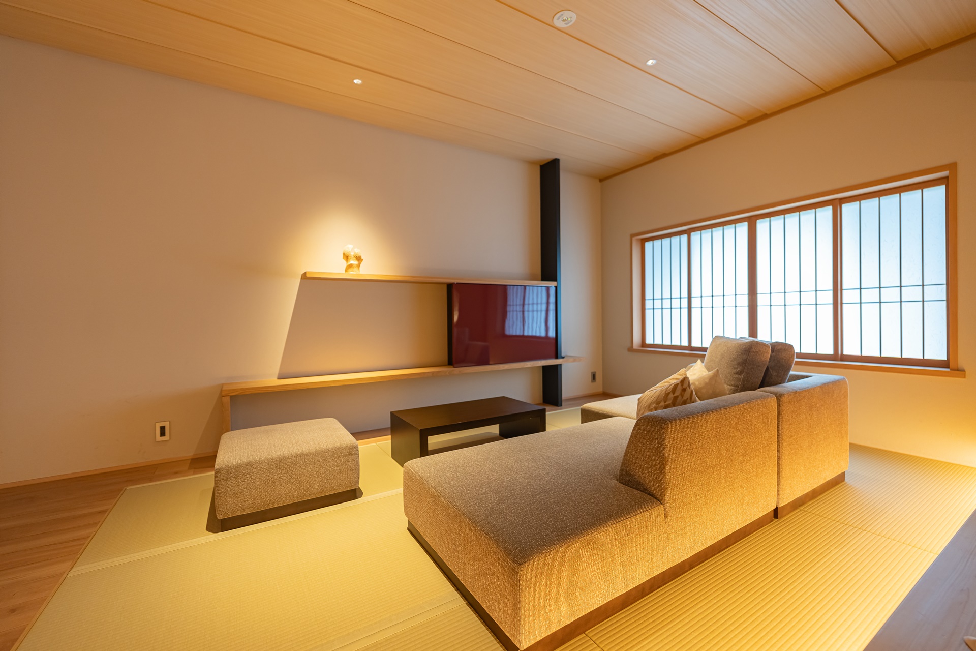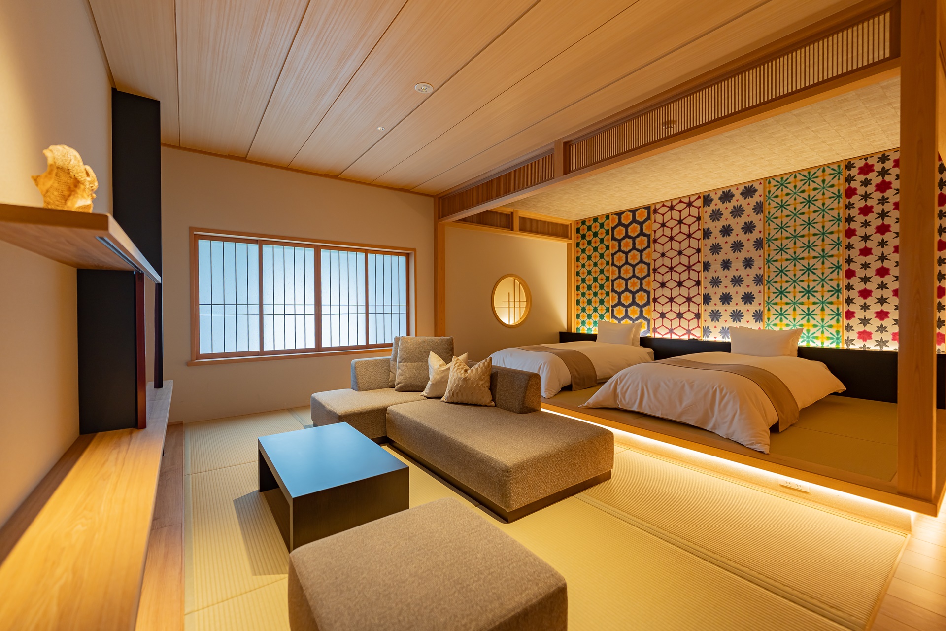 객실 문을 열면 따뜻한 나무 향과 함께 탁 트인 창으로 오토즈레 강의 풍경이 들어옵니다. 방 안은 다다미 바닥과 현대적인 가구가 절묘하게 조화를 이루며, 테이블 위에는 이 지역을 대표하는 하기야키 도자기와 오우치누리 칠기가 놓여 있어 머무는 순간부터 나가토의 전통과 만나는 듯합니다. 객실은 총 40실로 규모는 크지 않지만, 오히려 아늑함과 정갈함이 살아 있어 머무는 즐거움 자체를 배려한 듯합니다.