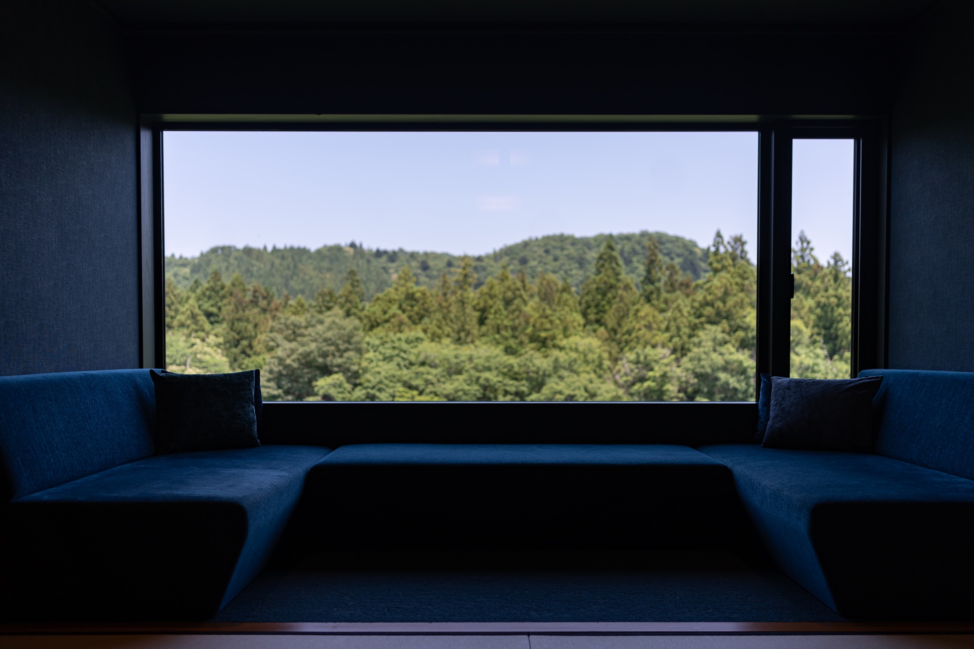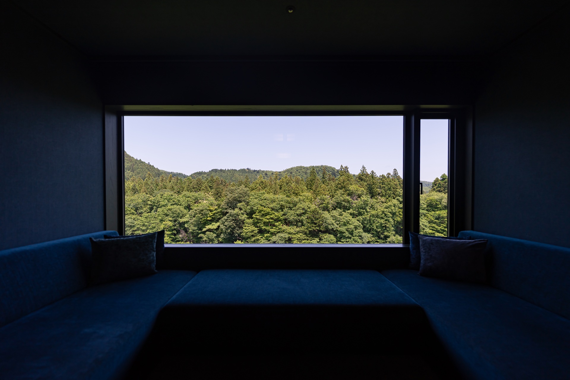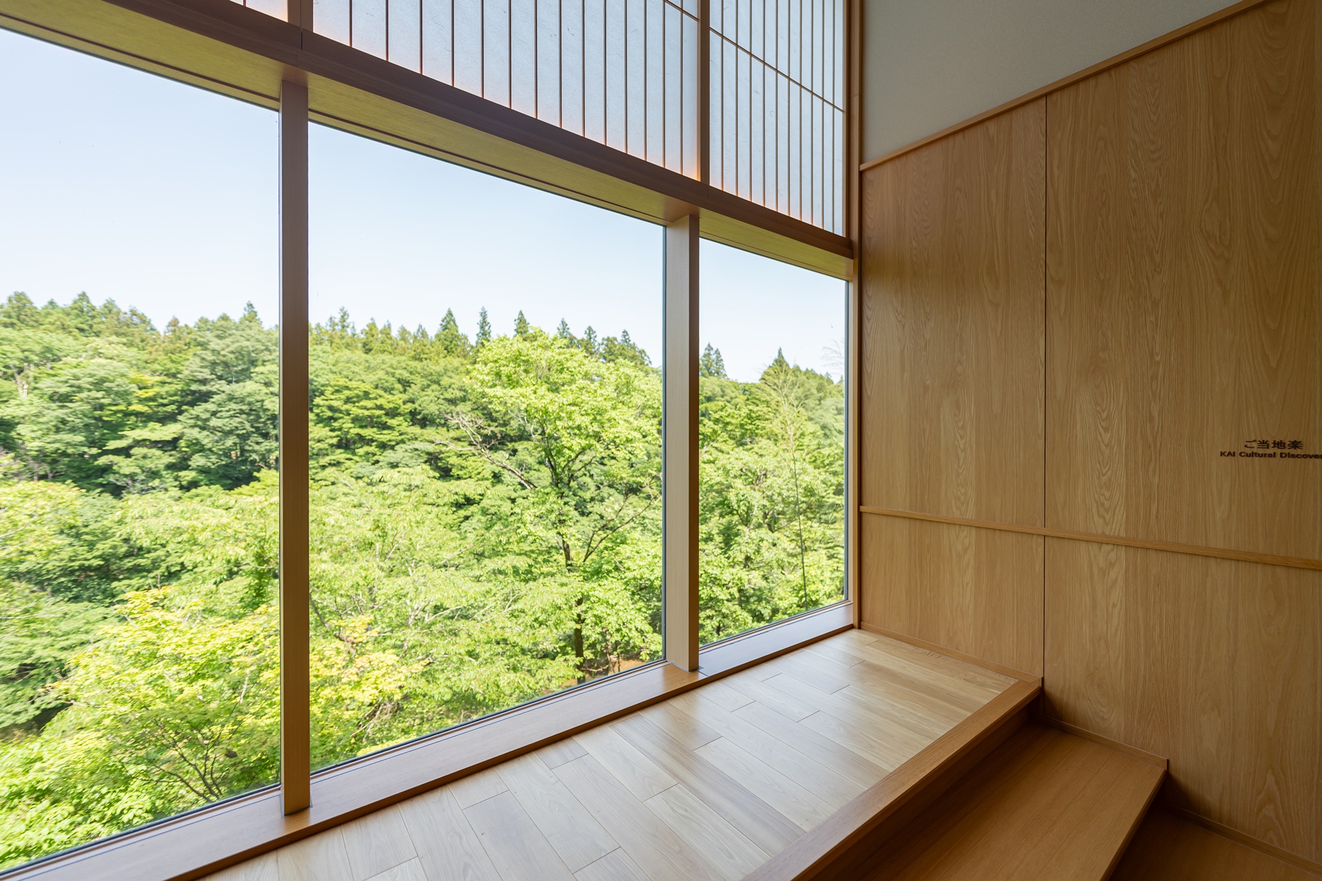 카이 아키우의 객실은 료칸 특유의 여백과 현대적 미니멀리즘을 결합한 구조입니다. 그 중에서도 이 객실을 특별하게 만드는 요소는 큰 창문으로 창문 너머에는 계곡, 숲, 강물,계 절이 바뀌는 풍경이 그대로 펼쳐집니다. 이 풍경은 단순한 객실 전망을 넘어 객실 구성의 중심 요소로 자리잡고 있습니다.