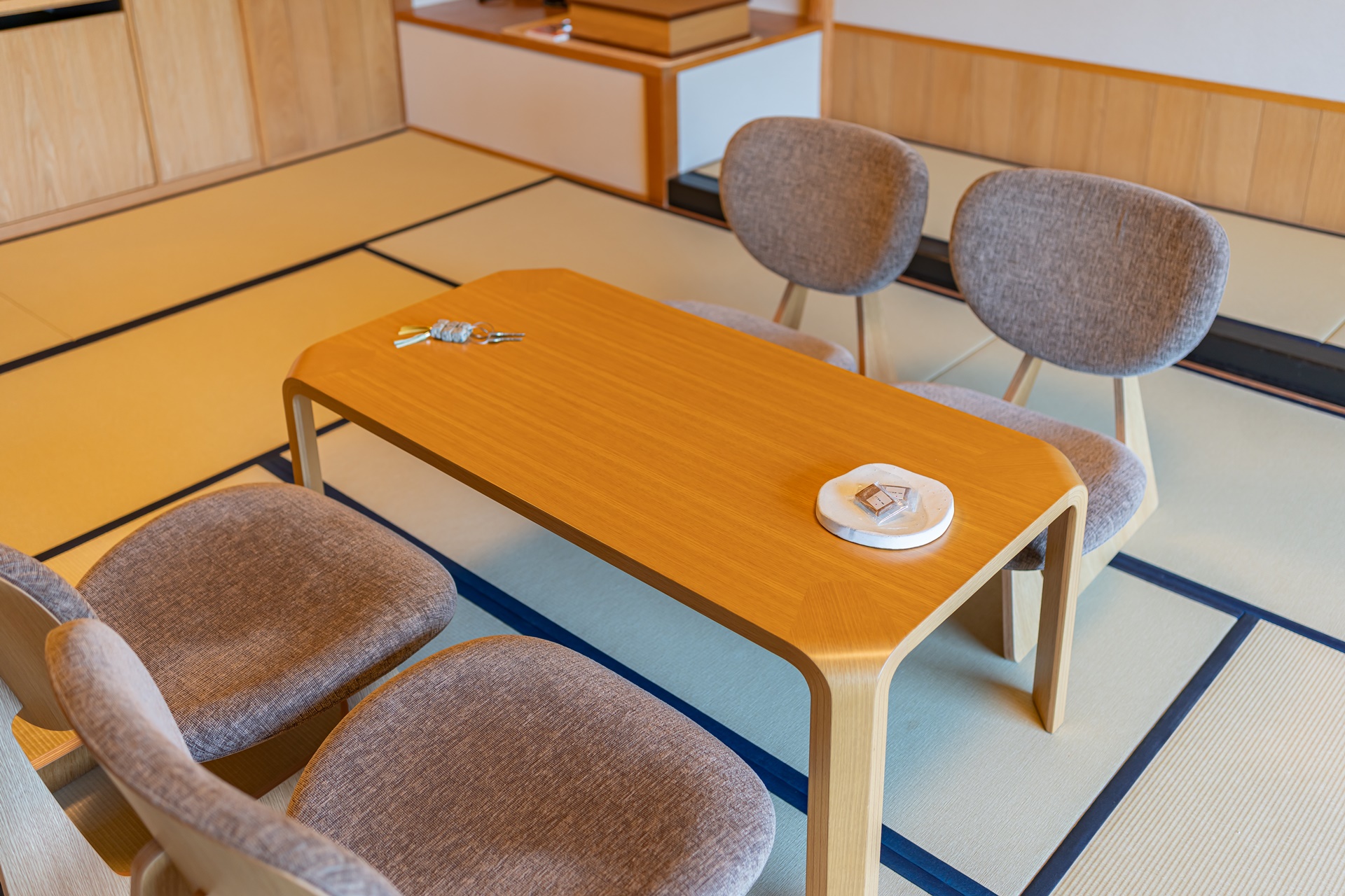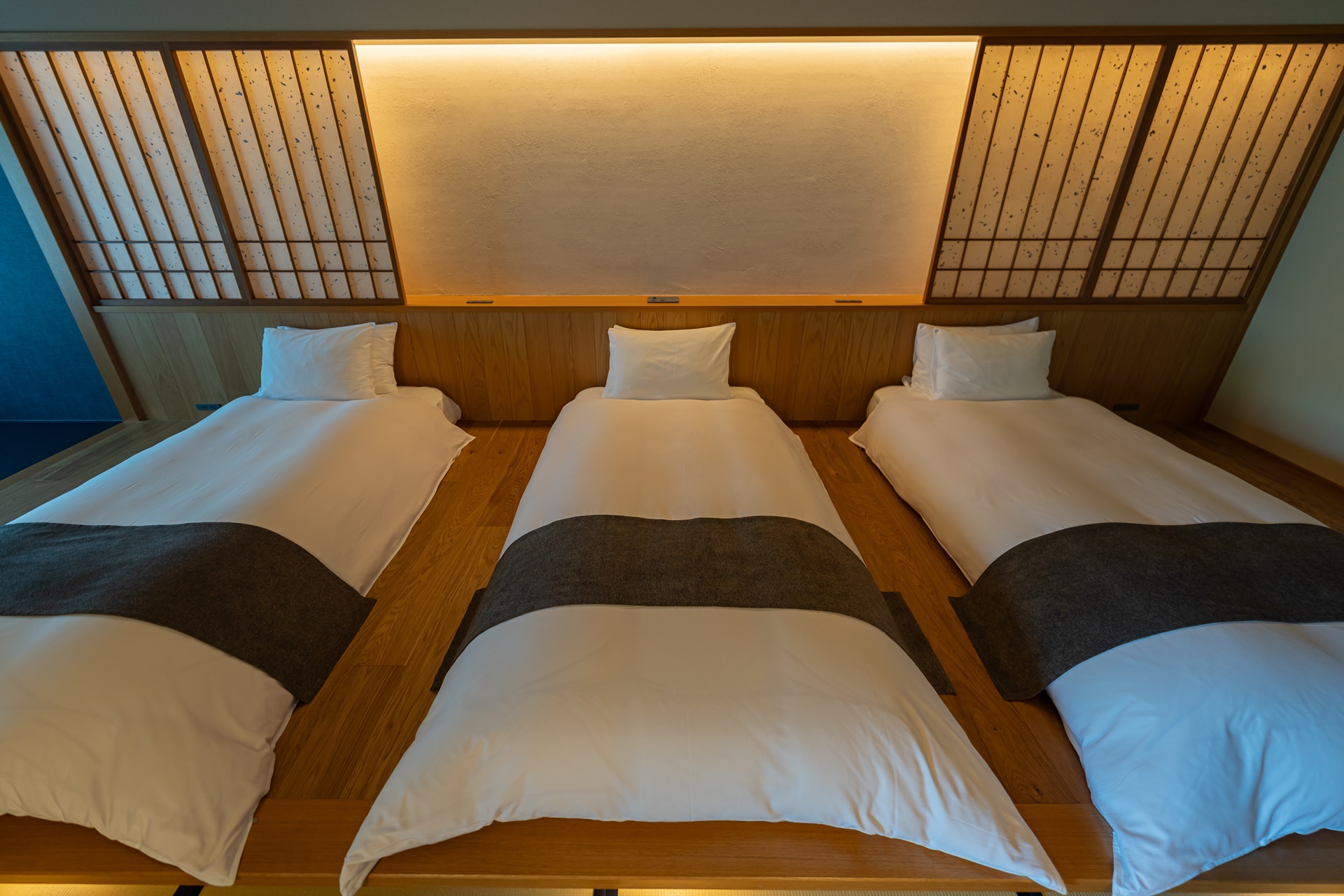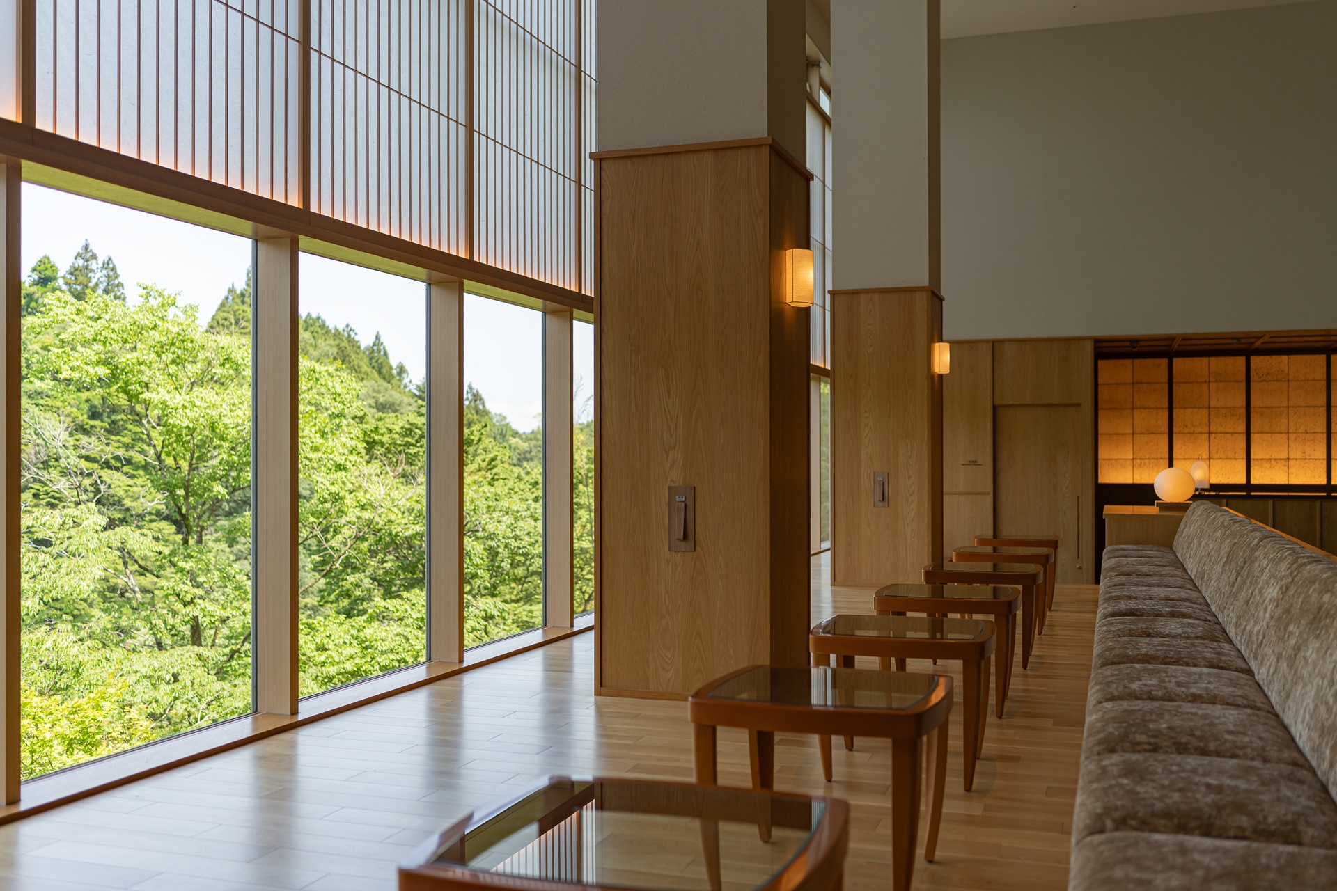 카이 아키우의 객실은 료칸 특유의 여백과 현대적 미니멀리즘을 결합한 구조입니다. 그 중에서도 이 객실을 특별하게 만드는 요소는 큰 창문으로 창문 너머에는 계곡, 숲, 강물,계 절이 바뀌는 풍경이 그대로 펼쳐집니다. 이 풍경은 단순한 객실 전망을 넘어 객실 구성의 중심 요소로 자리잡고 있습니다.