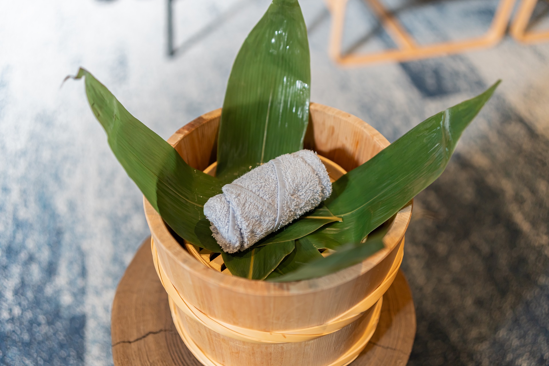 풀잎향이 강한 따뜻한 타올로 손을 닦고 온천에 대한 설명을 듣습니다. 이 엑티비티를 하고 나면 스템프가 찍힌 카이의 온천 수첩을 받을 수 있고 다른 호시노 리조트의 카이 시설에서도 스템프를 받을 수 있습니다.